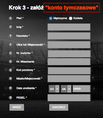 W pierwszym kroku wystarczy podać swojego e-maila, hasło (to kolumna z danymi konta, czyli danymi jakie będą Ci potrzebne za każdym razem podczas logowania do bukmachera), kraj, datę urodzenia, imię, nazwisko, adres i PESEL, a w miejscu bonus wybrać: Bonus zakładów sportowych. Najważniejszą rubryką jest ta z danymi osobowymi, ponieważ tę kolumnę będzie później weryfikował bukmacher i od poprawności wpisanych danych zależeć będzie, czy Twoje konto zostanie aktywowane.Wszystkie pola oznaczone gwiazdką są obowiązkowe, więc po uzupełnieniu całego formularza nie zapomnij sprawdzić czy nie przeoczyłeś jednego z wymaganych pól.