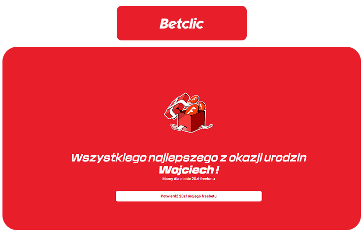 Freebet w dniu urodzin czeka na nas również w Betclic. W porównaniu z wcześniejszymi bukmacherami, Betclic nie informuje o urodzinowym prezencie w swojej zakładce z promocjami.