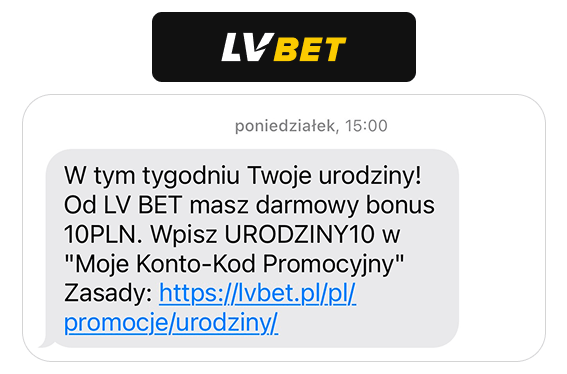W dniu naszych urodzin w LVBET czeka na nas prezent – freebet 10 PLN. Informacja o bonusie zostanie przesłana w formie wiadomości SMS, dlatego warto wcześniej upewnić się, że mamy zaznaczone zgody marketingowe u tego bukmachera.