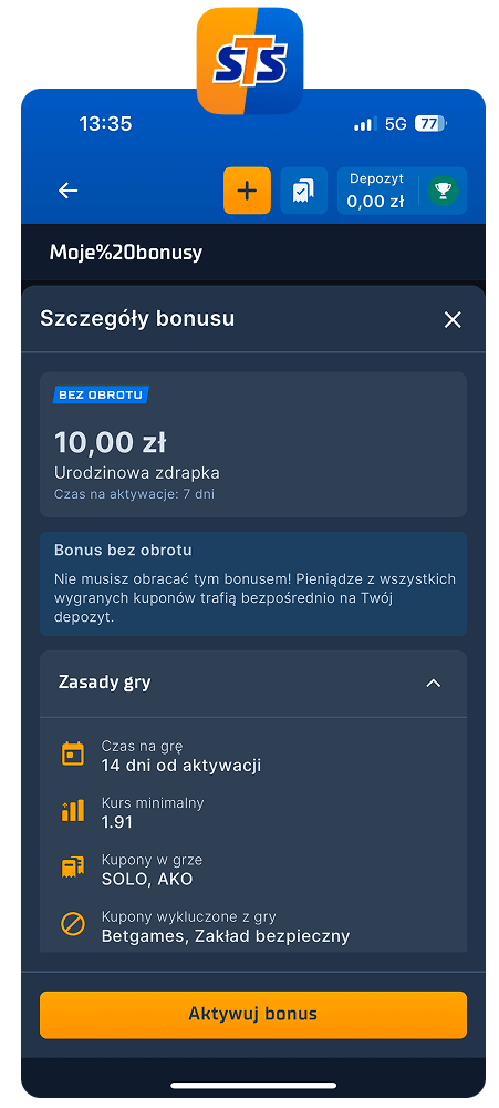 Po skorzystaniu ze zdrapki, można otrzymać bonus np. 10 PLN. Co ważne, środki nie podlegają warunkom obrotu, a wygrana od razu ląduje na konto główne. Bonus należy aktywować w ciągu 14 dni oraz wykorzystać na kupon SOLO lub AKO z kursem min. 1.91. Do promocji nie zalicza się oferta z Betgames i Zakładów bezpiecznych.