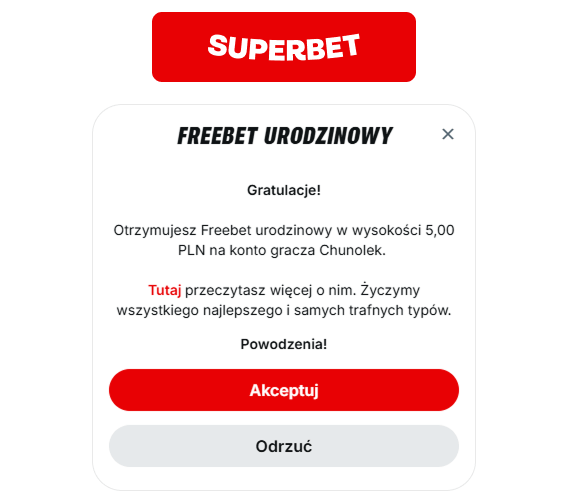 Skromny freebet urodzinowy czeka na nas również w Superbet, gdzie po zalogowaniu się na konto w dniu naszego święta otrzymamy komunikat o prezencie w wysokości 5 PLN. Co ważne, jest to podstawowa kwota bonusu urodzinowego i może różnić się w zależności od aktywności gracza.