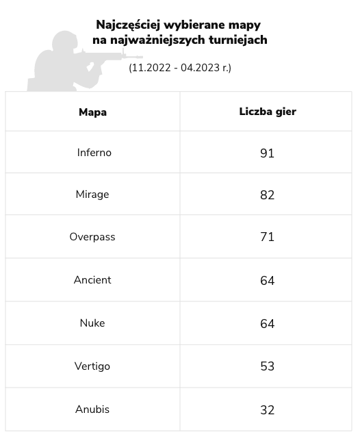 Najpopularniejszą mapą w 2025 roku na najważniejszych turniejach okazało się Inferno, które ma wyraźną przewagę nad Dustem i Mirage.