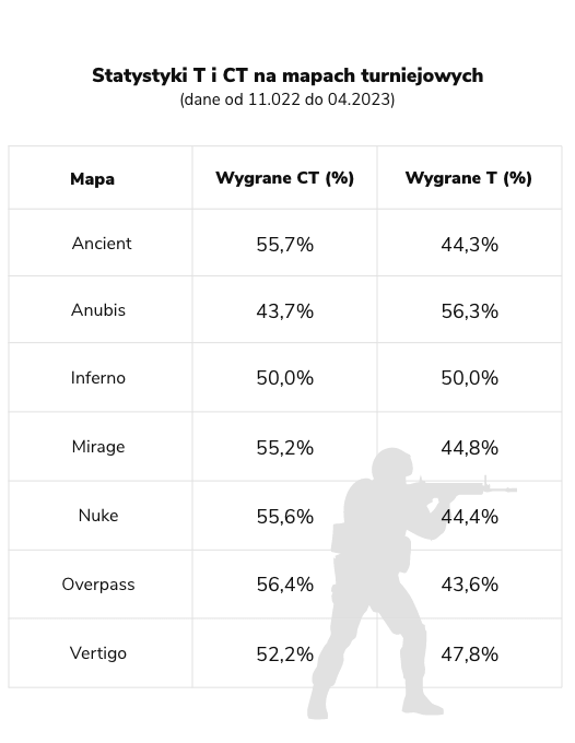 Jak widać, na 5 z 9 map lepiej radzą sobie Antyterroryści (CT), a ich przewaga jest najbardziej widoczna na mapie Train. Z kolei Terroryści (T) mają zdecydowaną przewagę na mapie Vertigo.