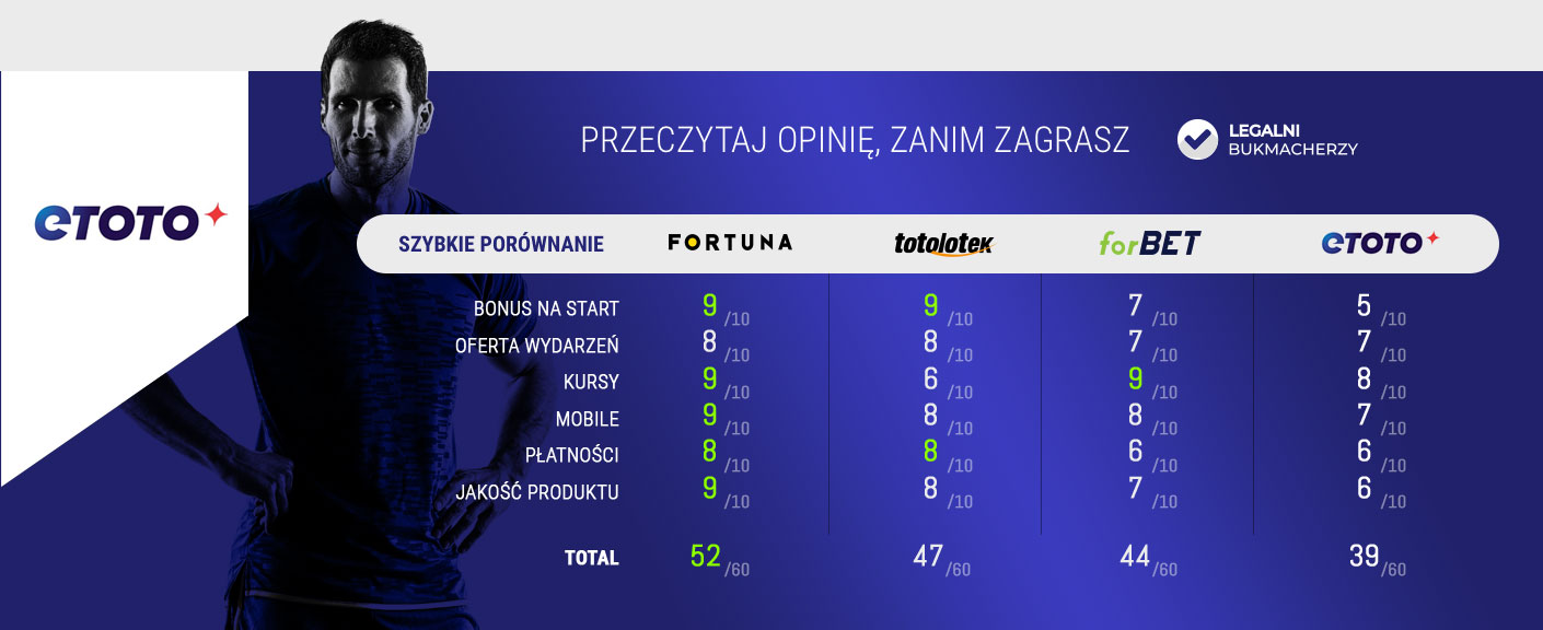 Przez wiele lat bukmacher Etoto kojarzony był przede wszystkim z popularnymi ambasadorami w postaci dziennikarzy sportowych. Firma zmieniła nieco swoje podejście, a obecnie gwarantuje całkiem ciekawy produkt z solidnym bonusem powitalnym oraz ofertą skierowaną do wszystkich graczy.