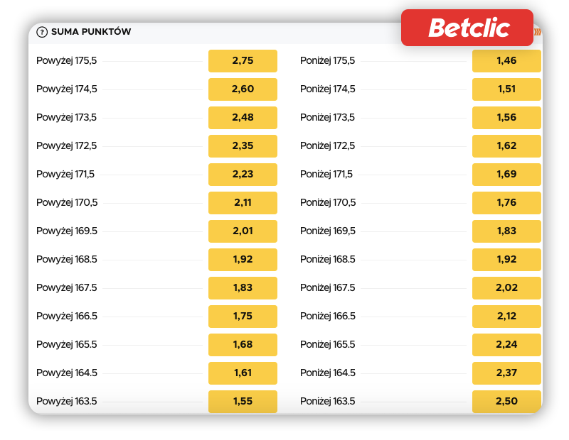 U tego bukmachera będziesz mógł nie tylko wytypować liczbę punktów obu drużyn (razem), ale także rozbudowane indywidualne zdobycze zawodników. Wśród nich m.in. znajdują się statystyki na liczbę punktów, asyst, zbiórek, przechwytów, a nawet… bloków czy trafionych rzutów za 3 pkt.