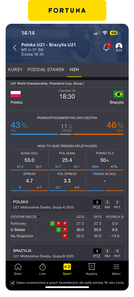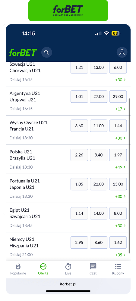Tym, co w pierwszej kolejności wyróżnia forBET na tle konkurencji jest bardzo duży wybór rynków przedmeczowych. Jego klienci mogą obstawiać ponad 60 różnych typów zakładów na najważniejsze rozgrywki. Dla przykładu na mecz Polska vs Brazylia na ME U21 forbet wystawił ponad 50 rynków przy 20 Fortuny i 25 Superbet. Różnica jest więc spora.