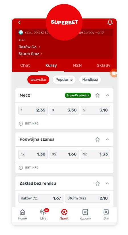 Tak prezentują się kursy bukmacherskie na mecz: Raków Częstochowa vs Zrinjski Mostar. Oferta zakładów dostępna jest w STS.