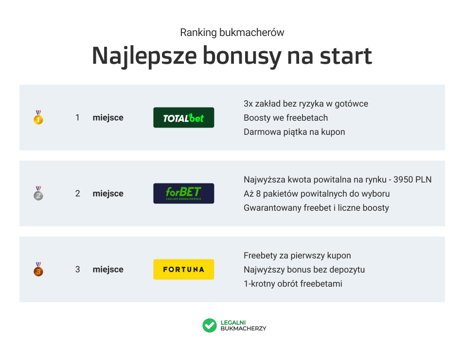 - Miejsce 1 – TOTALbet (zakłady bez ryzyka 333 PLN, bonus bez depozytu 5 PLN)