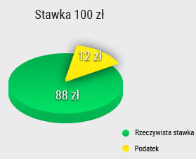 Obecnie obowiązujące przepisy przewidują 12% podatku od stawki zakładów. Na podanym obok przykładzie wyjaśniliśmy graficznie działanie podatku od stawki na Twoje ewentualne zyski. Korzystając z tej informacji musisz pamiętać, że w tym przypadku stawka, która zostanie przemnożona przez kurs będzie wynosiła 88 złotych.