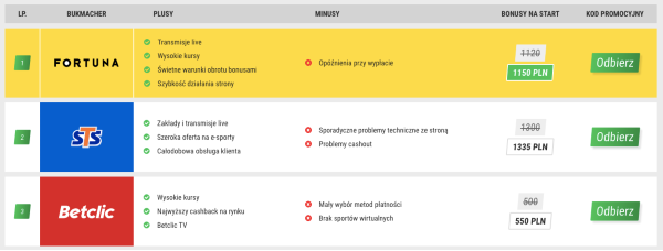 Zapoznanie się rankingiem przybliży wam oferty poszczególnych operatorów. Polecamy założenie kont u kilku z nich, ponieważ warto mieć szerszy zakres dostępnych promocji specjalnych, czy też na bieżąco porównywać oferty.