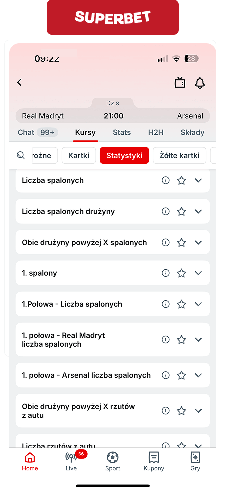 W Superbet znajdziesz takie rynki na spalone, jak np. zakłady z handicapem, over/under dla obu drużyn lub jednej, a także liczba spalonych danej drużyny w pierwszej połowie lub która drużyna zaliczy pierwszego spalonego.