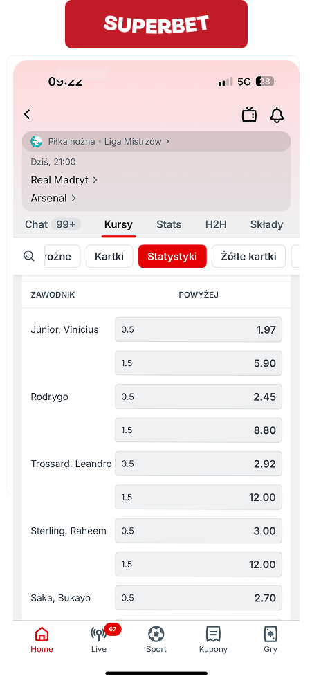 Również w przypadku najważniejszych spotkań, jak chociażby ćwierćfinałowy mecz Ligi Mistrzów, Superbet wypada lepiej niż konkurencja. Tutaj przykład jest rewanżowe starcie Real – Arsenal.