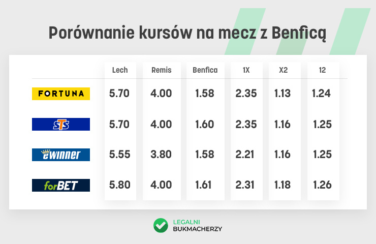 Końcowe rozstrzygnięcia w grupie D można typować między innymi u kolejnego legalnego na polskim rynku operatora zakładów wzajemnych, czyli w firmie Fortuna. Jeśli ktoś wierzy w zajęcie przez Lecha pierwszego miejsca, to bukmacher daje ofertę kursową 15. Zajęcie miejsc 1-2, które i tak będzie ogromnym sukcesem oceniane jest jako prawdopodobieństwo z kursem 5. Warto w tym miejscu nadmienić, że Fortuna jest liderem rankingu legalnych polskich bukmacherów, który prowadzą nasi eksperci.