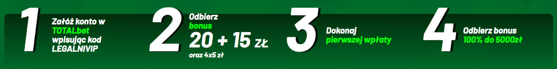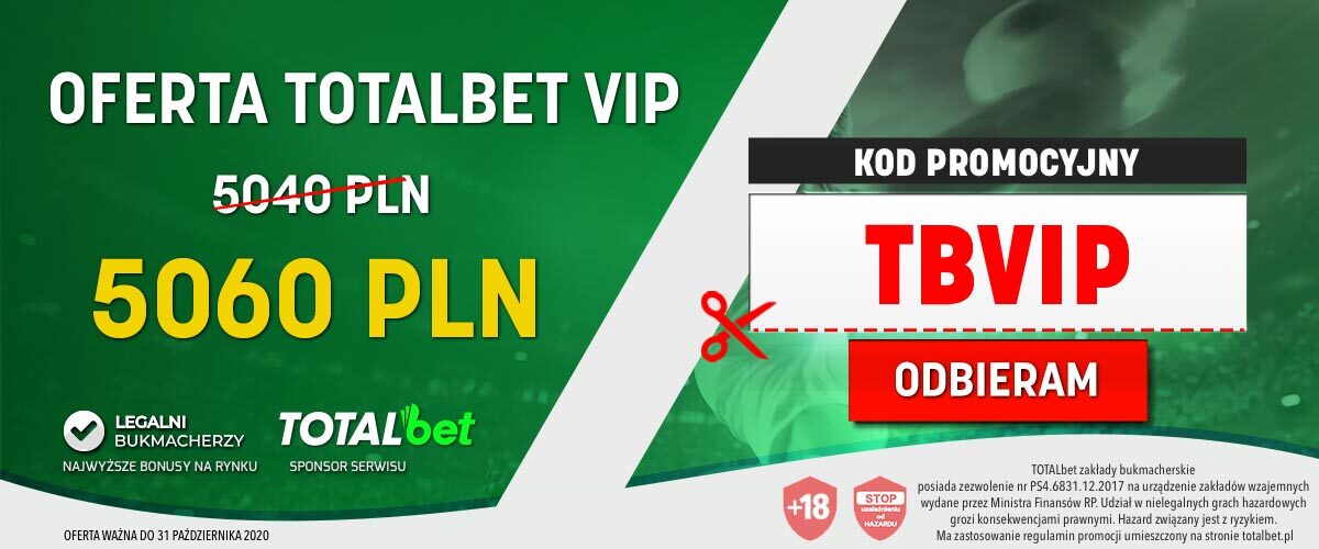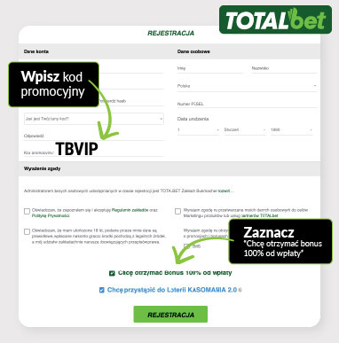 Wykorzystaj kod promocyjny TOTALbet: TBVIP i załóż konto u bukmachera.