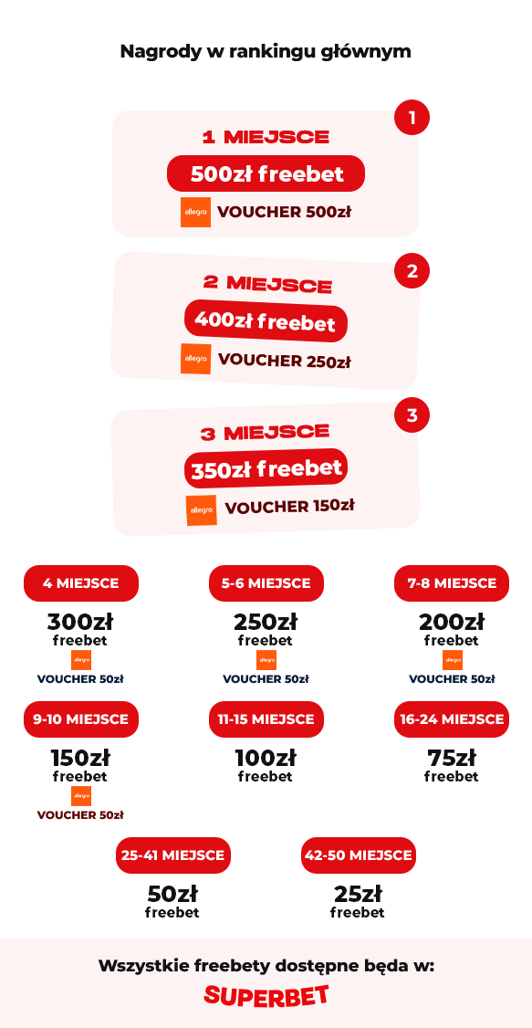 1 miejsce 500 zł freebet do wykorzystania w Superbet +karta podarunkowa do wykorzystania na Allegro w kwocie 500 zł