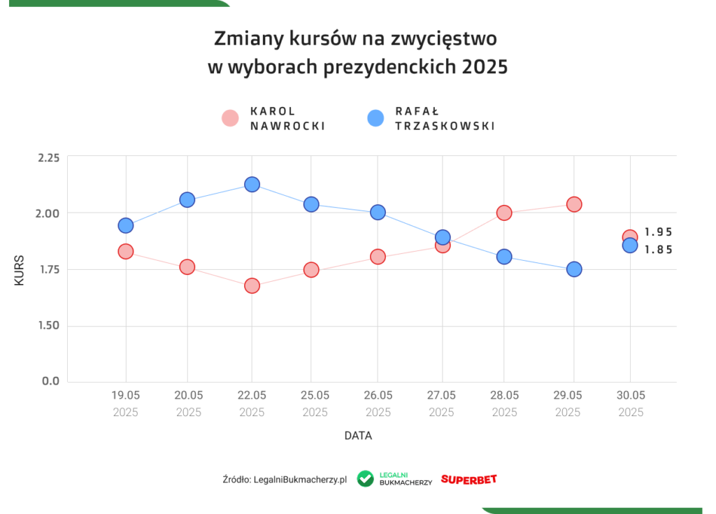 30.05: Na ostatniej prostej zauważyliśmy delikatną korektę bukmachera Superbet na korzyść Karola Nawrockiego. Być może wpływ na taki obrót spraw mają poparcie od Grzegorza Brauna oraz kolejne spotkanie ze Sławomirem Mentzenem. Nadal jednak faworytem zdaniem analityków jest Rafał Trzaskowski. Czy faktycznie bukmacherzy będą mieli rację i to kandydat obecnego rządu zostanie prezydentem? Czas pokaże.