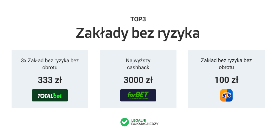 Z oferowanych przez bukmacherów promocji, zakład bez ryzyka jest kluczowym bonusem, który ma bardzo duży wpływ na ranking najlepszych legalnych bukmacherów. Gracz może bowiem wytypować kupon, nie martwiąc się o końcowy rezultat, gdyż otrzyma zwrot stawki.