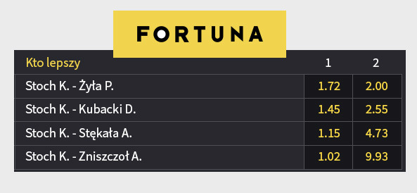 Konkurencyjną ofertę przygotowuje Fortuna. W czasie rozgrywania spotkań na popularnej mączce mamy możliwość obstawienia zakładu na liczbę sprawdzeń śladu przez sędziego. Ponadto pojawiają się zakłady specjalne typu ujemny punkt, dyskwalifikacja czy obrona piłki meczowej.