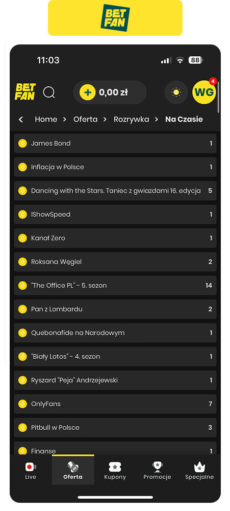 Zakłady w Betfan są na pewno najlepiej zaprezentowane ze wszystkich buków. Sekcja „ROZRYWKA” jest atrakcyjna dla oka i przejrzysta. Co więcej, bukmacher nie boi się eksperymentować z formą, co udowodnił, wystawiając kursy na zdarzenia związane z pewną niebieską platformą czy Roksaną Węgiel.