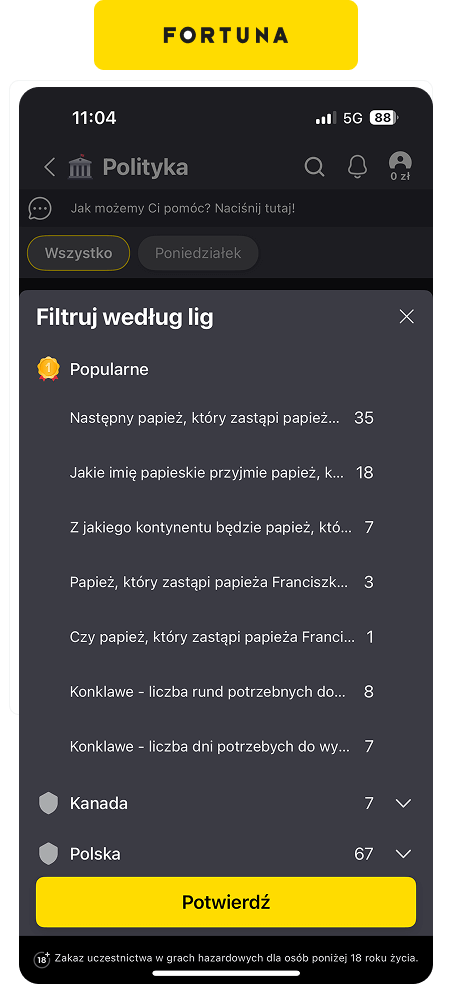 Zakłady specjalne w Fortunie są naprawdę znakomicie prowadzone. Widać to było np. podczas wyboru nowego papieża w 2025 roku. Pojawiła się rozbudowana oferta nie tylko na nazwisko nowego papieża, ale również na imię, kontynent z którego będzie pochodzić, a nawet ile potrzebnych będzie rund czy dni, by wybrać papieża.