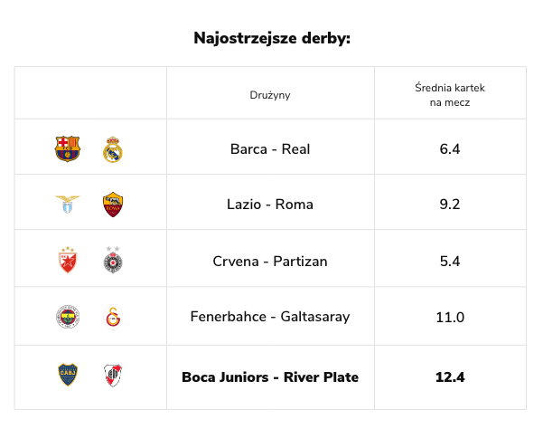 Jak widać derby w niektórych krajach to doskonała okazja, by do swoich kuponów dodać nieco inne zdarzenia niż tylko typy na zwycięzcę meczu. Dodatkowo nierzadko odnotowywane w raporcie pomeczowym są czerwone kartoniki. Stało się to niemal normą w większości derbowych spotkań w ligach Ameryki Południowej. Choć te rozgrywki nie wzbudzają zbyt dużego zainteresowania wśród większości typerów, to warto do nich sięgnąć pod kątem analizy rynków, które dotyczą kartek.