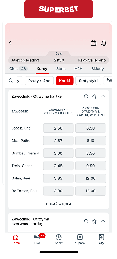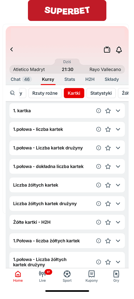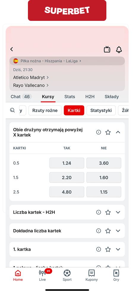 Superbet to jeden z niewielu bukmacherów dający możliwość typowania kartek live. Obstawiać można: