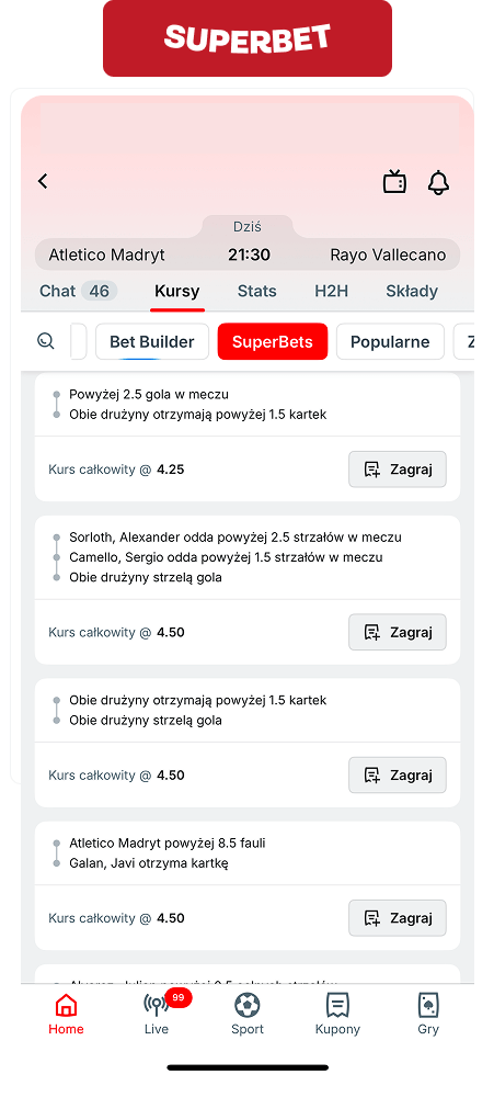 Kolejnym aspektem, który mocno wyróżnia Superbet w kontekście zakładów na kartki, są Superbets – czyli gotowe zakłady łączone, które bukmacher przygotowuje specjalnie na najlepsze mecze piłkarskie danego dnia.