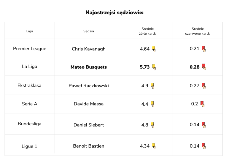 Obstawiając żółte i czerwone kartki nie zawsze pomocna okazuje się statystyka dotycząca liczby fauli. Sędziowie prowadzący spotkania na Wyspach Brytyjskich mają w zwyczaju oszczędzać zawodników, nawet gdy Ci zagrają naprawdę ostro. Trochę inaczej sytuacja prezentuje się na Półwyspie Iberyjskim, gdzie niektórzy arbitrzy są mniej pobłażliwi.