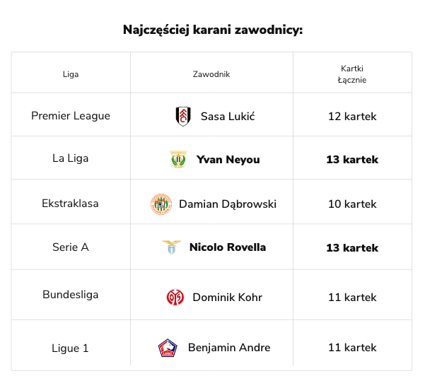 Poniżej prezentujemy najczęściej karane kartkami drużyny w najlepszych ligach Europy.